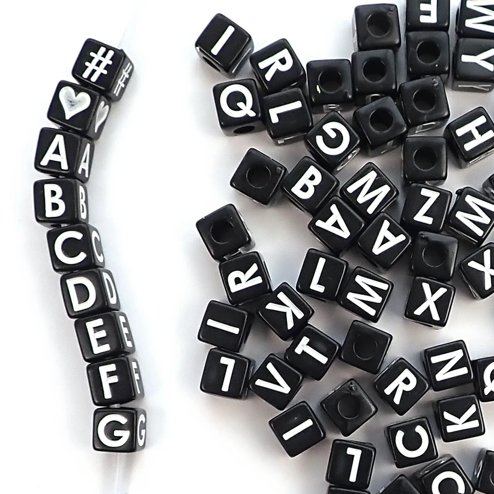 Plastic black number and letter cube beads with vertical holes that run from top to bottom. These letter and number beads are commonly used for making key chains, jewelry, accessories, ornaments and decorations. Number beads and alphabet beads can be used to spell team names and special sayings. These beads can be strung with other beads such as pony beads, sports ball beads, heart beads and other shapes to create unique bead projects and crafts.