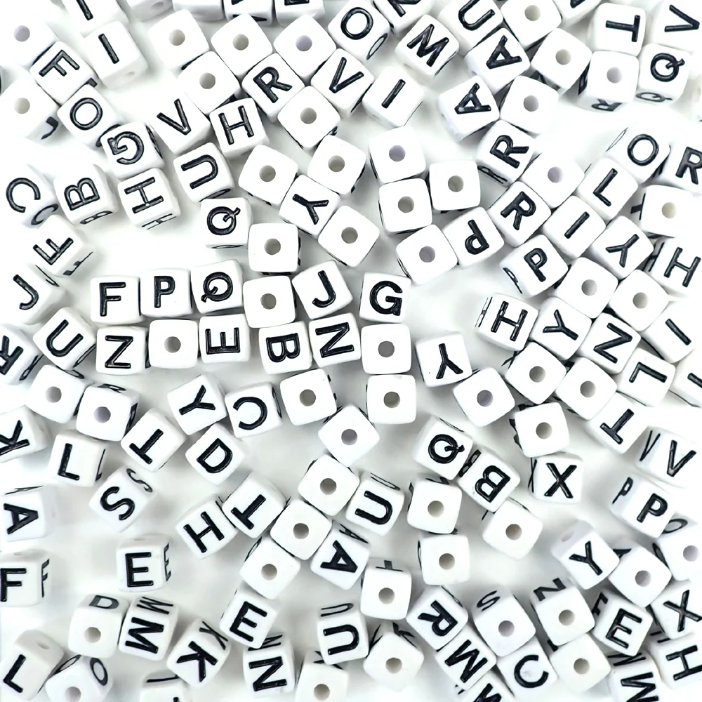 Plastic white alphabet and number cube beads with vertical holes that run from top to bottom. These letter and number beads are commonly used for making key chains, jewelry, accessories, ornaments and decorations. Alphabet beads can be used to spell team names and special sayings. These beads can be strung with other beads such as pony beads, sports ball beads, heart beads and other shapes to create unique bead projects and crafts.
